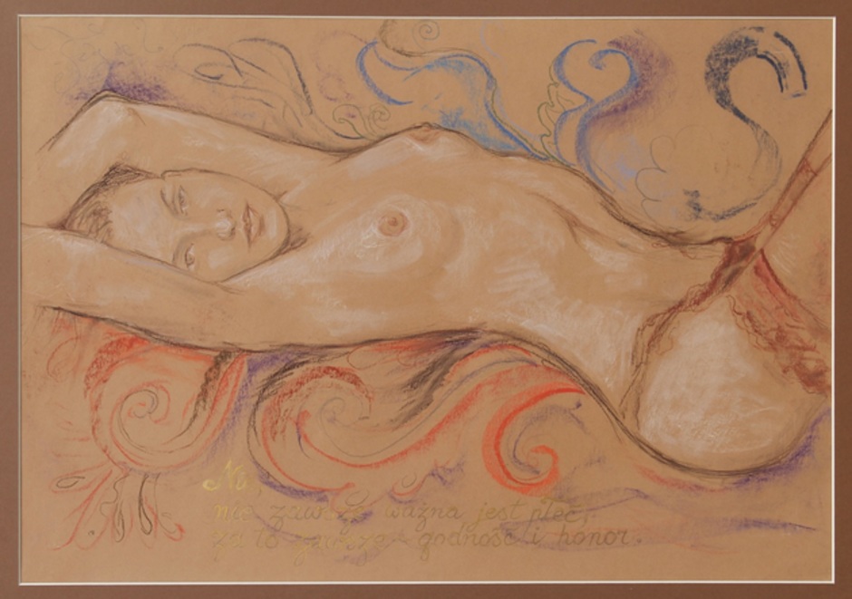 poniżej: ''Nie zawsze ważna jest płeć - za to zawsze godność i honor"; X.2o2o r; pastel+sepia; format: 60x40 cm; cena: 10,ooo złbelow: 'Gender isn't always important, but dignity and honor are''; october 2o2o r; crayon+sepia; format: 60x40 cm; price: 10,ooo zł